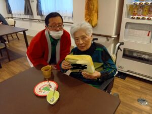ささやかですが入居者様おひとりずつにポーチをプレゼントさせていただきました。手渡しさせていただき大変喜んでいただけていたと思います。日常と違う雰囲気を味わっていただく事で入居者様、従業員共に活気に繋がると思うので、こういった行事を大切に取り組んで行きたいと思います。
