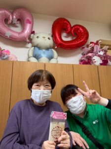 ご利用者様に職員からチョコのプレゼント🎁✨をお渡し、写真撮影を行いました♪