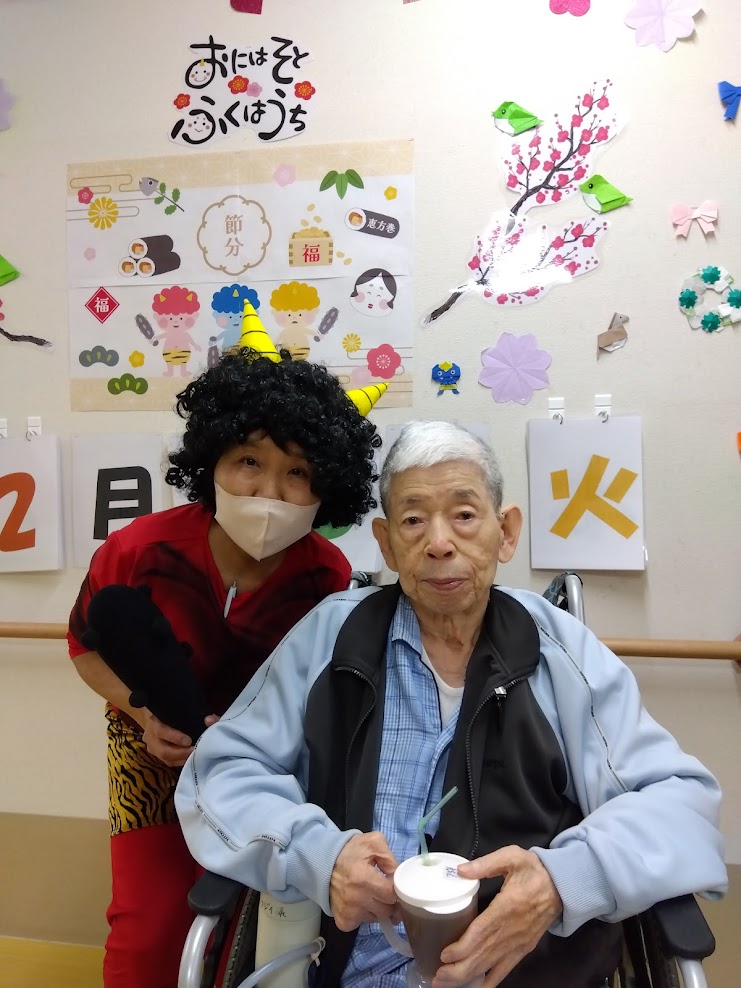 いつもと変わらない昼食前で、、ご利用者様が食堂に向かわれている際に‥なんと❗❗赤鬼👹が現れました🫥