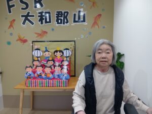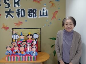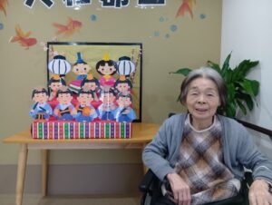 職員が作ったひな壇と一緒にお写真をとりました!