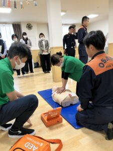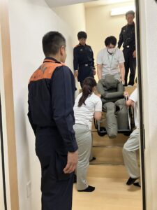 ⚪︎消防士より心肺蘇生法や、簡易担架の作り方や車椅子を抱えて階段を登る方法などを教えていただきました😊