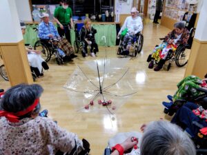 大きな透明傘に投げ込みます!