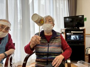 割り箸を使って紙コップを渡すリレーで、これまた難しいのです🤨🤨