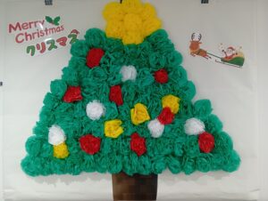 廊下の壁面にお花紙で作ったクリスマスツリーをバックに