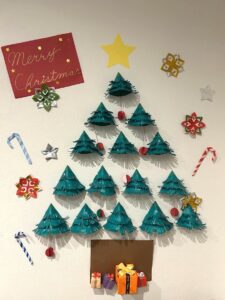 食堂には大きいクリスマスツリーがあります🎄